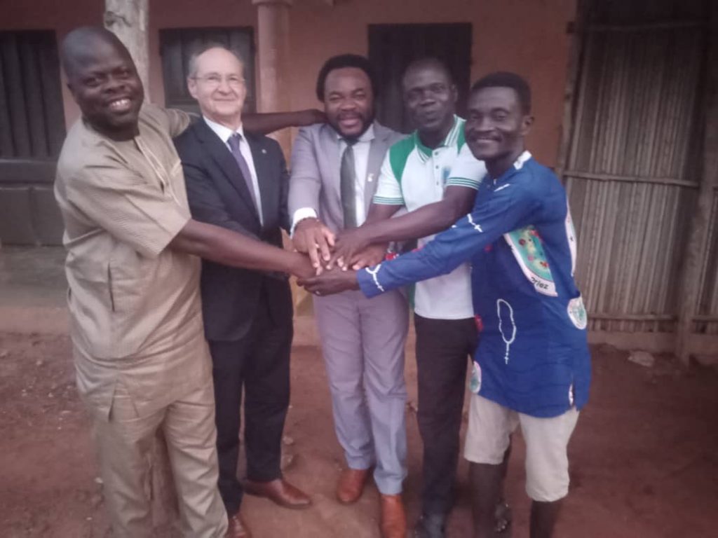 Ein Treffen mit dem Bürgermeister Justin Kanninkpo (2.v.r.) der ein Gebiet mit 300 000 Menschen betreut, auch das Dorf Sowe-Ndokpo wo wir den ersten Brunnen bereitstellen werden, die Freude darüber ist riesen Groß.